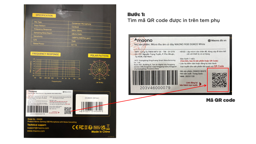 Bước 1: Tìm mã QR code được in trên tem phụ DTR dán trên hộp sản phẩm Maono.