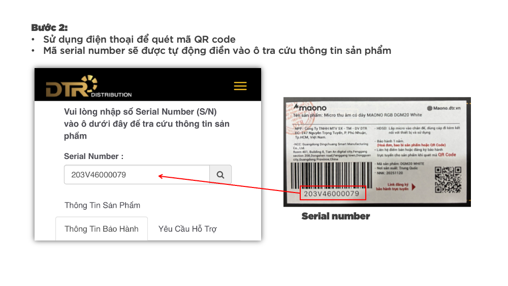 Để mang đến trải nghiệm thuận tiện và nhanh chóng cho khách hàng, Maono tại Việt Nam do DTR phân phối chính hãng đã triển khai bảo hành điện tử thông qua QR Code. Người dùng có thể dễ dàng tra cứu và đăng ký thông tin bảo hành trực tuyến chỉ với vài thao tác đơn giản, thay thế cho việc lưu giữ giấy tờ truyền thống.