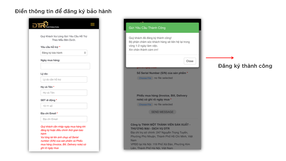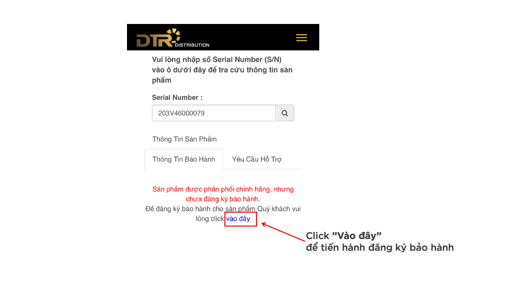 Sau khi tra cứu, nếu hệ thống có hiển thị sản phẩm là hàng chính hãng do DTR phân phối nhưng chưa được đăng ký/kích hoạt bảo hành, bạn cần thực hiện đăng ký bảo hành để đảm bảo quyền lợi.