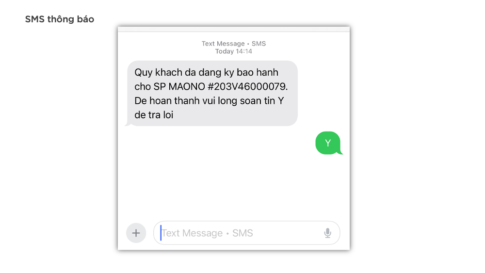 Bước 4: Để hoàn tất kích hoạt bảo hành, bạn chỉ cần xác nhận tin nhắn được hệ thống gửi về theo cú pháp Y (tin nhắn xác nhận sẽ được phản hồi trong vòng 1-2 ngày).