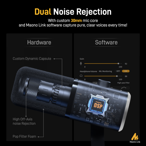 • Chống ồn kỹ thuật số (Noise Cancellation) qua Maono DSP, giảm tiếng môi trường khi dùng USB.