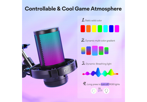 Maono DGM20S còn gây ấn tượng với hệ thống đèn RGB đa chế độ, từ chế độ tĩnh, chuyển động cho đến chuyển màu liên tục. Điều này giúp không gian làm việc, bàn gaming hay góc livestream trở nên nổi bật, chuyên nghiệp và mang đậm cá tính hơn.