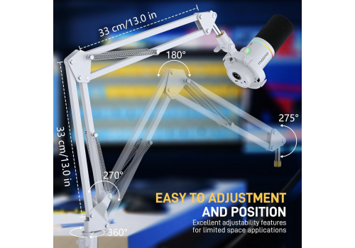 • Điều chỉnh linh hoạt nhiều hướng: chân đế xoay 360°, gập lên/xuống 270° và khớp đòn xoay 180°. Mỗi nhanh dài 13 inch (33cm), lý tưởng setup bàn làm việc nhỏ hoặc studio tại nhà.