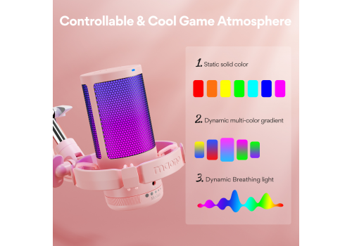 Maono DGM20 không chỉ mạnh về âm thanh mà còn nổi bật v dải đèn RGB sống động. Micro được trang bị hệ thống đèn RGB đa hiệu ứng, với nhiều chế độ tĩnh, động và chuyển màu liên tục. Điều này giúp setup livestream, gaming hay phòng thu tại nhà trở nên sinh động, chuyên nghiệp và cảm hứng hơn, đúng chuẩn phong cách streamer hiện đại.