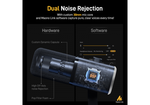 Ở chế độ USB, Maono PD100X hỗ trợ Maono DSP Noise Cancellation (thiết lập thông qua phần mềm Maono Link), giúp giảm đáng kể tiếng ồn môi trường và giữ cho âm thanh luôn trong trẻo.