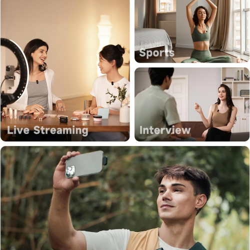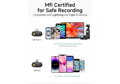 • Mic cài áo không dây gồm 2 TX + 2 RX (2 micro + 2 đầu thu type-C và Lightning), phù hợp quay phim, livestream, sáng tạo nội dung cần đa thiết bị thu như iPhone, hệ sinh thái Apple, Android và camera.