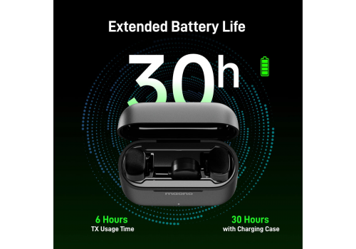 • Thiết kế siêu nhẹ mỗi mic chỉ 5.9g với thời lượng liên tục đến 6 giờ, hộp sạc di động đi kèm hỗ trợ sạc cho mic khoảng 30 giờ.